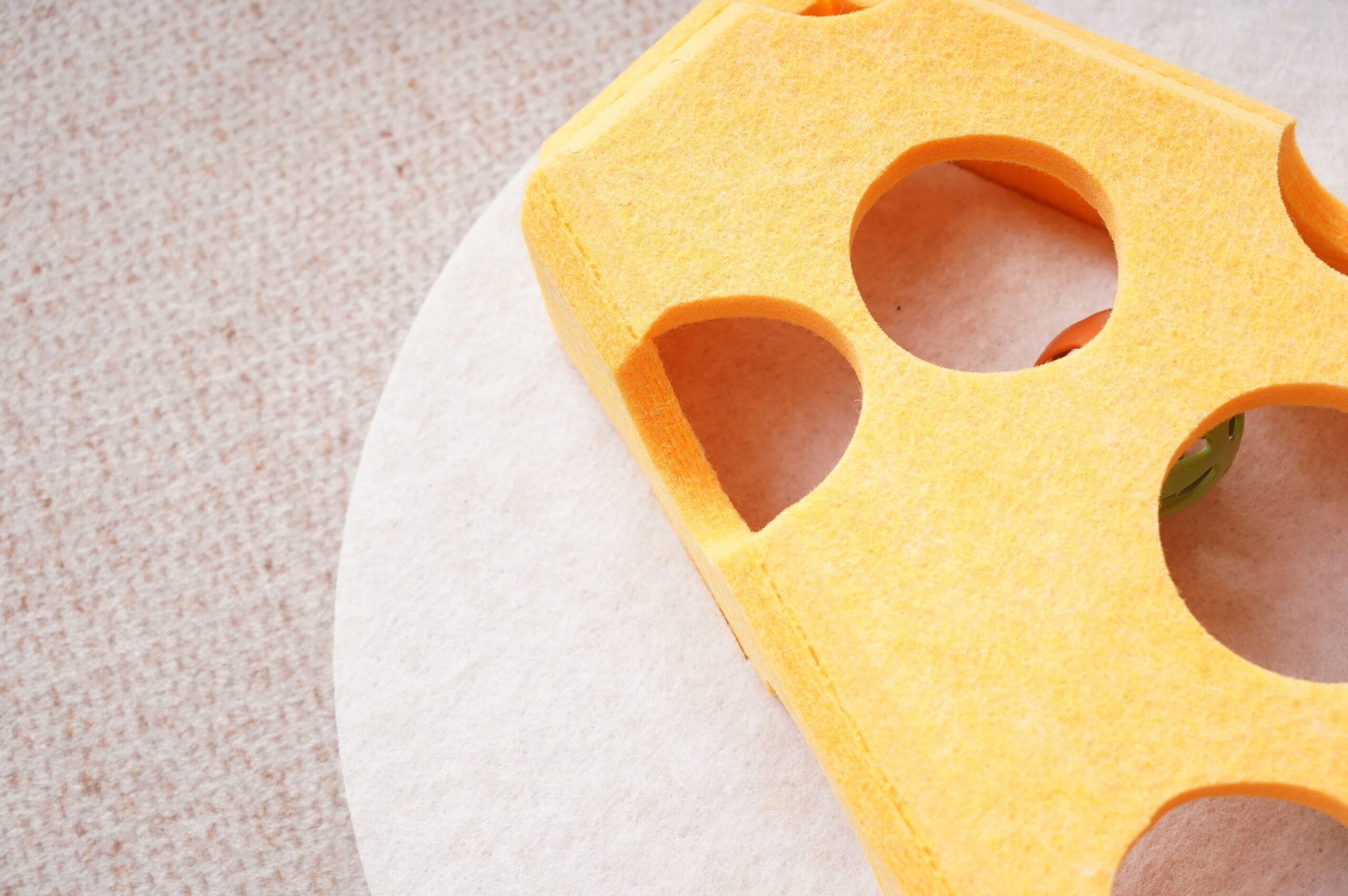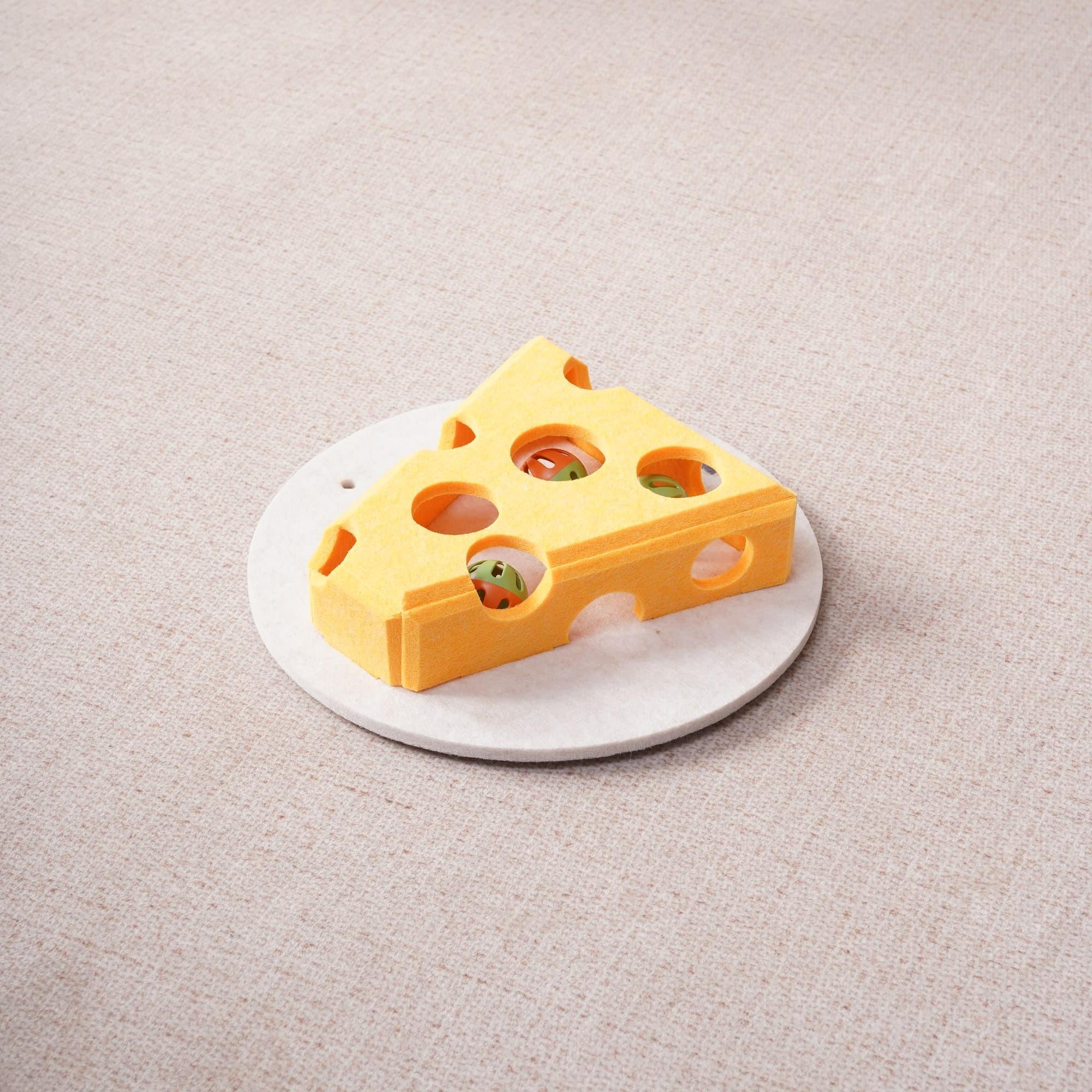 Cat Puzzle Toy Box — 3-in-1 Felt Cheese Box with Rolling Balls, Spring Wand & Treat Puzzle